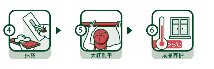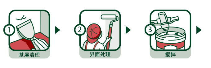 基层处理: | 基层须坚实、无明水、无浮灰与污物。上道工序留下的沟槽、孔洞等应进行填实修整,须用按标准稀释的墙锢混凝土界面剂进行渗透密实界面处理。 |