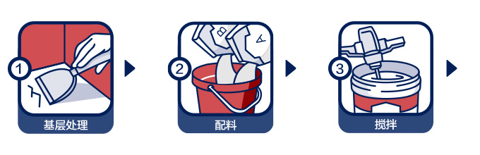 基层修补:裂缝、凹凸不平处和孔洞墙面需用墙诺快硬抹灰砂浆进行填充找平,地面需用坊水固堵漏灵进行修补找平,阴阳角用坊水固堵漏灵抹成圆弧角或钝角,防止产生裂缝; 基层清理:基层应坚实、平整、无灰渣、无浮灰、无明水,地漏和管道根部除去锈迹和灰渣; 基层润湿:需使用刷子或滚筒用水进行预润湿。若使用墙锢混凝土界面剂或地锢地面界面剂进行润湿处理,可增大涂刷面积,提高防水涂层粘结力。 |